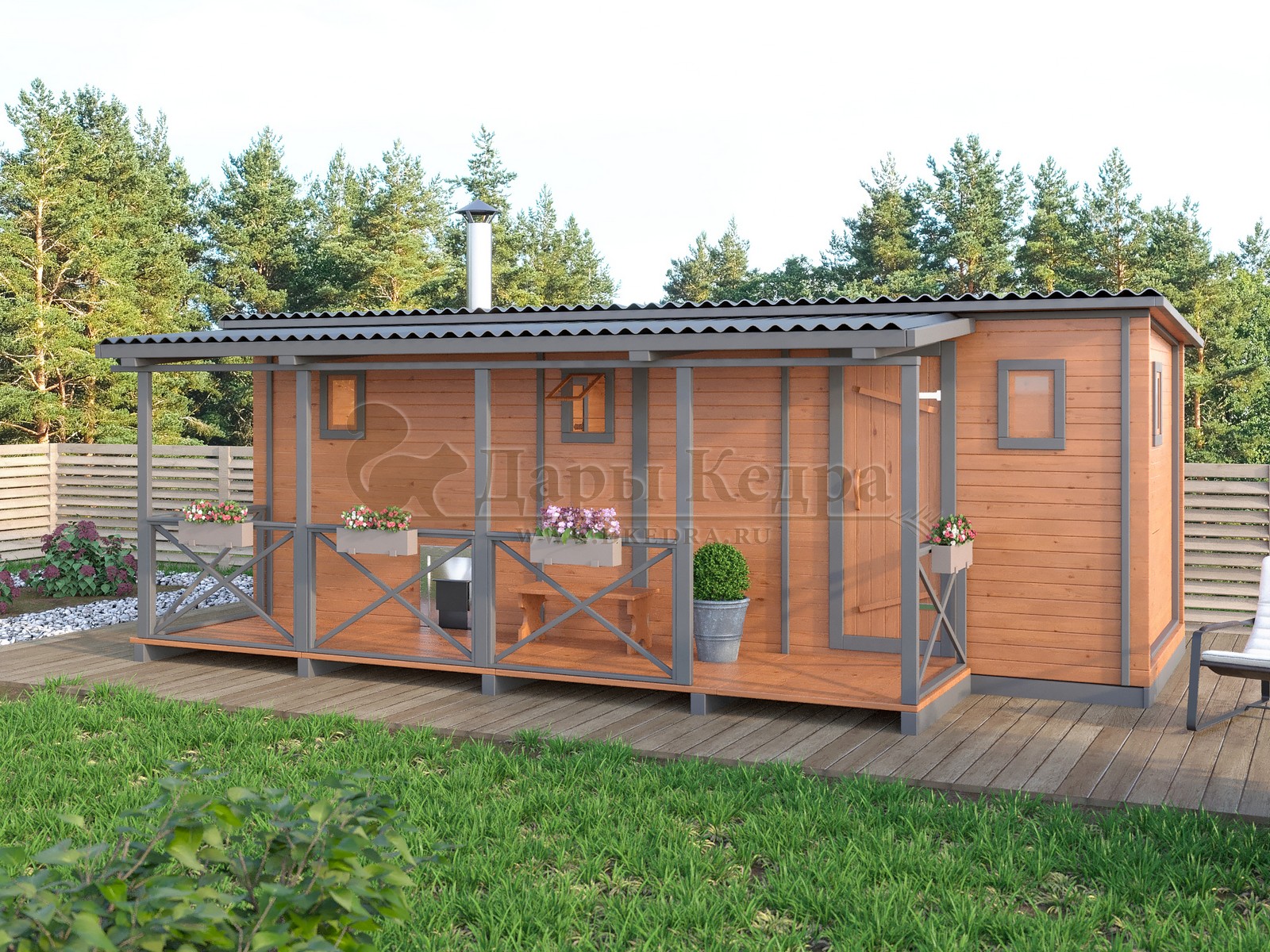 • Каркасно-щитовая баня из кедра «Мега» с верандой Это классическая прямоугольная модель бани с тремя отделениями: предбанником, моечной и парилкой. Для удобства пользования предбанник оснащен лавочкой и вешалкой. В моечной находится лавка и полочка из кедра. Парилка оборудована двухуровневым открытым полком и печью. Время растопки такой бани не превышает 30 минут. На просторной веранде можно оставить вещи или отдохнуть после парения. Каркасно-щитовую баню можно заказать как в готовом, так и в разборном варианте. В разборной модели готовые щиты из кедра быстро собираются в полноценное строение, что также позволяет исключить лишний строительный мусор. Такая баня не требует полноценный фундамент, поэтому при необходимости ее можно перенести в другое место. Обращаем Ваше внимание, что в карточке товара изображено изделие с дополнительными опциями для ознакомления. Перед оформлением заказа, проконсультируйтесь у менеджера и он предоставит актуальную информацию по стандартной комплектации Древесина кедра насыщена эфирными маслами и фитонцидами, которые активируются при воздействии температур. Таким образом, парение в каркаско-щитовых банях из кедра становится еще полезнее.