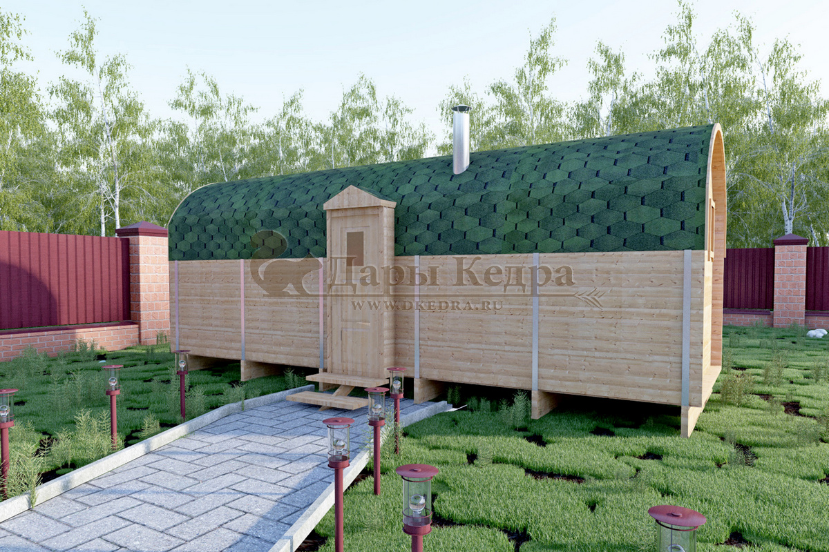 • Баня-бочка буханка из кедра 6 метров с верандой Главной отличительной особенностью данной бани «Буханка» является полная обшивка гибкой черепицей всей внешней части бани, а так же наличие крытой входной группы. Включает в себя небольшую веранду, раздевалку, которая служит комнатой отдыха, моечную и парильное отделение. Для удобства пользования в раздевалке находятся лавочки и вешалка из кедра. Моечная оборудована душевым поддоном, полочкой и лавочкой. В парильном отделении по обе стороны расположены двухуровневые открытые полки, печь установлена между ними у дальней стены. Время растопки такой бани не превышает 30 минут. По вашему желанию баню-бочку можно укомплектовать козырьком, верандой и печью с внешней загрузкой, благодаря которой весь мусор после топки остается на улице. Баня-бочка буханка не требует полноценный фундамент, поэтому при необходимости ее можно перенести в другое место. Обращаем Ваше внимание, что в стандартную комплектацию бани входят полки открытого типа в парной с обеих сторон. Дополнительно можно заказать полок закрытого типа или лавку! Кедр обладает ароматическими свойствами. Он не деформируется и влагоустойчив, при правильном уходе за деревом на нем не развиваются грибки и плесень.