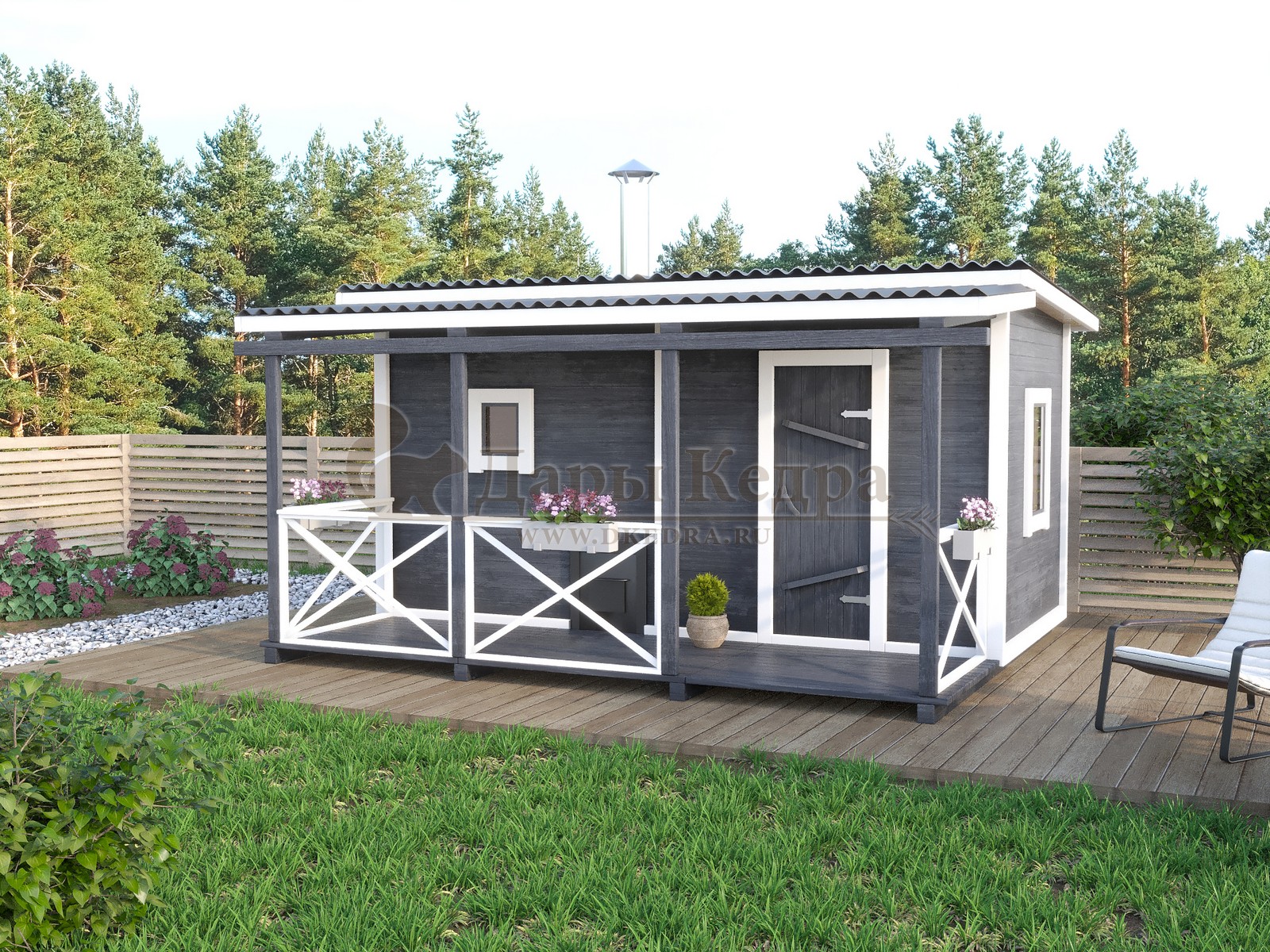 • Каркасно-щитовая баня из кедра «Сканди» с верандой Это классическая прямоугольная модель бани с двумя отделениями: предбанником и парилкой, а так же удобной терассой. Предбанник оснащен лавочкой и вешалкой. Парилка оборудована двухуровневым открытым полком и печью. Время растопки такой бани не превышает 30 минут. Каркасно-щитовую баню можно заказать как в готовом, так и в разборном варианте. В разборной модели готовые щиты из кедра быстро собираются в полноценное строение, что также позволяет исключить лишний строительный мусор. Такая баня не требует полноценный фундамент, поэтому при необходимости ее можно перенести в другое место. Древесина кедра насыщена эфирными маслами и фитонцидами, которые активируются при воздействии температур. Таким образом, парение в каркаско-щитовых банях из кедра становится еще полезнее.