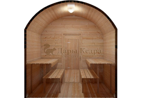 Это более просторная модель за счет увеличенной высоты потолков и ровного пола. В такой модели раздевалка совмещена с моечной. Тут установлен душевой поддон, вешалка, полочка и лавочка из кедра. В парильном отделении по обе стороны расположены двухуровневые открытые полки, печь находится между ними у дальней стены. Время растопки такой бани не превышает 30 минут. По вашему желанию баню-бочку можно укомплектовать козырьком, верандой и печью с внешней загрузкой, благодаря которой весь мусор во время топки остается на улице. Баня-бочка буханка не требует полноценный фундамент, поэтому при необходимости ее можно перенести в другое место.