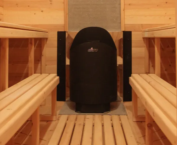 Баня-буханка более просторная за счет увеличенной высоты потолков и ровного пола. Козырек не только украшает баню, но и защищает оставленную обувь от дождя. Лавочки из кедра находятся по всей длине бани-бочки с обеих сторон. Печь расположена в парилке около дальней стены. Время растопки такой бани не превышает 30 минут. В зависимости от выбранного размера баня-бочка буханка с козырьком имеет следующую комплектацию: