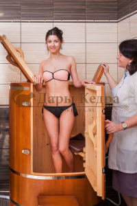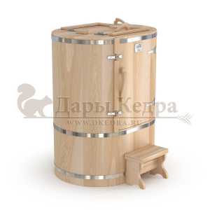 Овальная фитобочка из кедра - это мини парная, которую можно использовать не только в спа-салонах, но и дома. Овальная модель более просторна и удобна в использовании. Толщина стенок составляет 40-45 мм, что позволяет увеличить срок службы изделия. Она оборудована откидными створками, дверцей и отверстием для головы. Во время парения человек сидит внутри кедровой бочки, а голова находится снаружи. Благодаря этому исключается возможность перегрева. Подлокотники из кедра, встроенные ручки на створках и двери делают эксплуатацию более удобной.