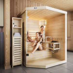 Трехместная угловая финская «Элит» сауна кабина из кедра и липы с электрокаменкой